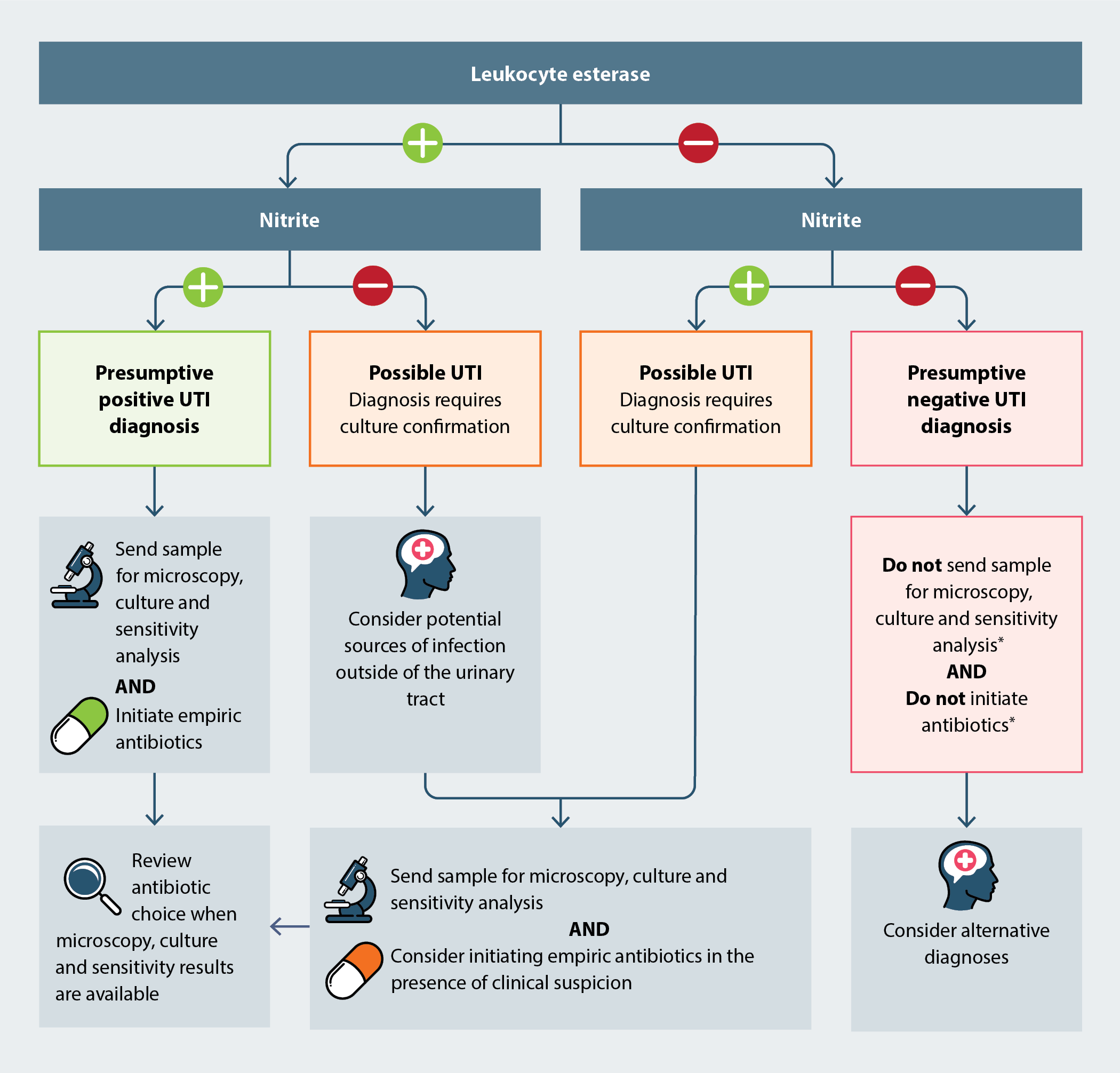 In children aged 3 – 12 years, a presumptive UTI diagnosis can be made based on a positive dipstick test result for both leukocyte esterase and nitrite (Figure 1); initiate empiric antibiotics and send the urine sample for microscopy, culture and sensitivity analysis.1 A positive result for either leukocyte esterase or nitrite is usually sufficient to proceed with empiric antibiotic treatment if characteristic UTI symptoms and signs are present (Figure 1); send the urine sample for microscopy, culture and sensitivity analysis.1